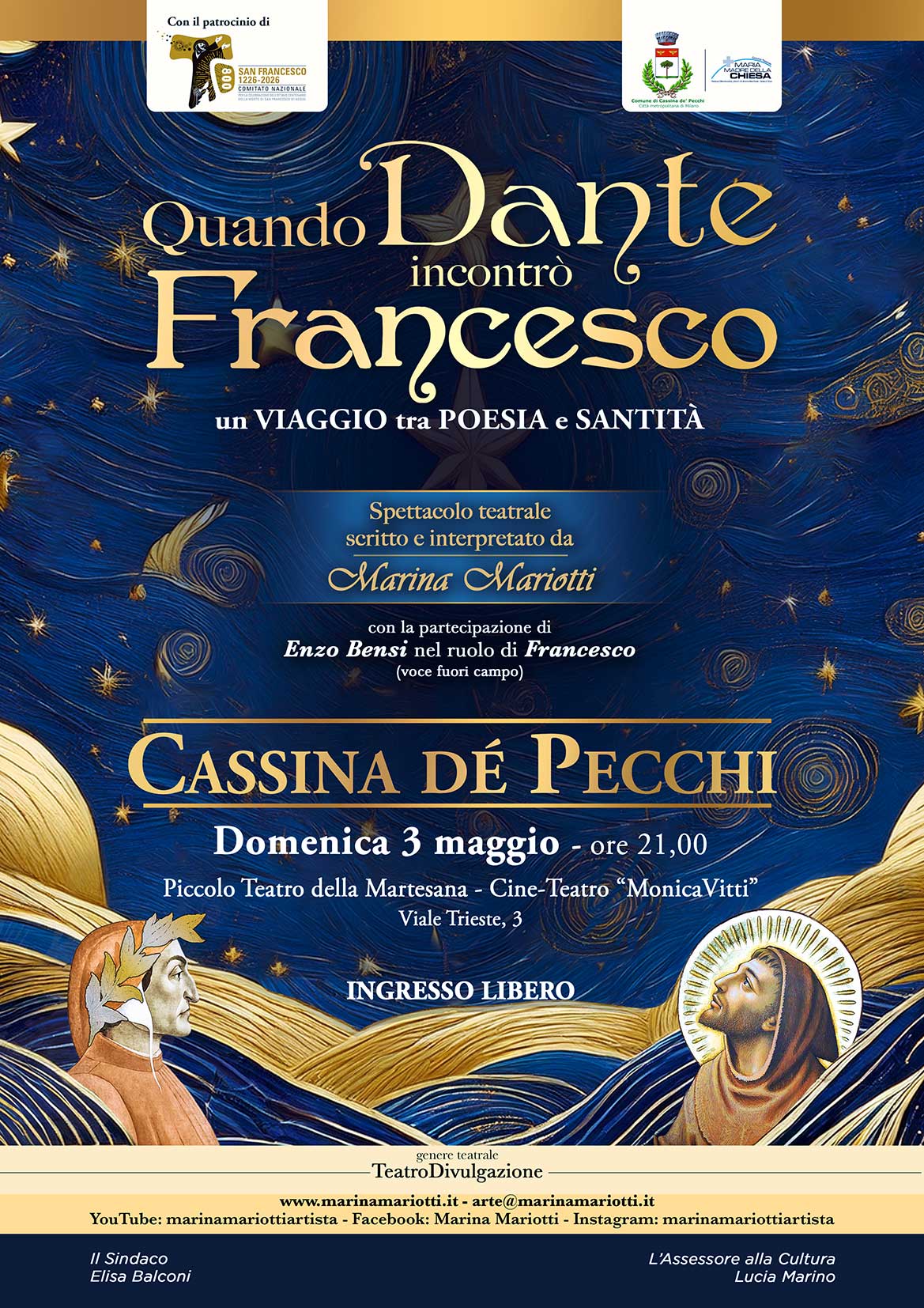 “Quando Dante incontrò Francesco” è uno spettacolo scritto e interpretato da Marina Mariotti, con la partecipazione di Enzo Bensi (voce fuori campo nel ruolo di Francesco).
