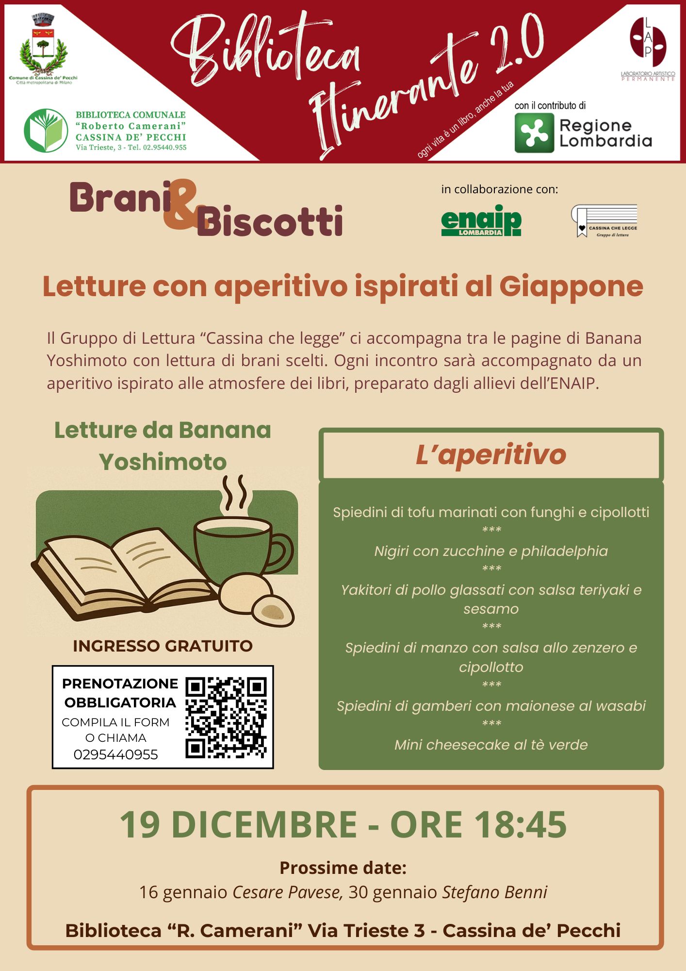 Il Gruppo di Lettura “Cassina che legge” ci accompagna tra le pagine di Banana Yoshimoto con lettura di brani scelti. Ogni incontro sarà accompagnato da un aperitivo ispirato alle atmosfere dei libri, preparato dagli allievi dell’ENAIP.