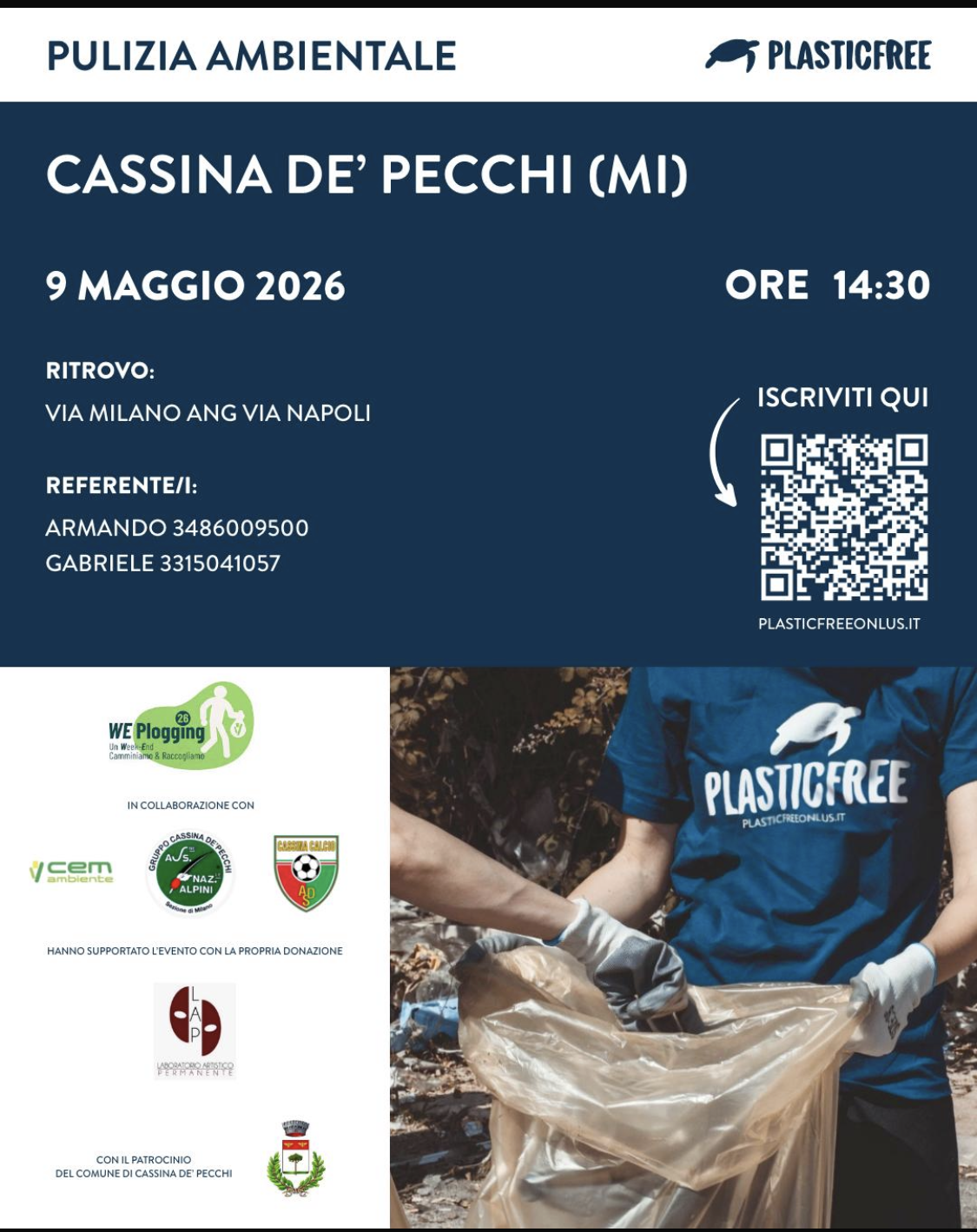 A seguito della convenzione tra il Comune e Plasticfree, si informa che il giorno 9 maggio 2026, condizioni meteo permettendo, si terrà un Plogging in accordo con Cem Ambiente sul territorio che coinvolgerà molti comuni, tra cui Cassina de' Pecchi.